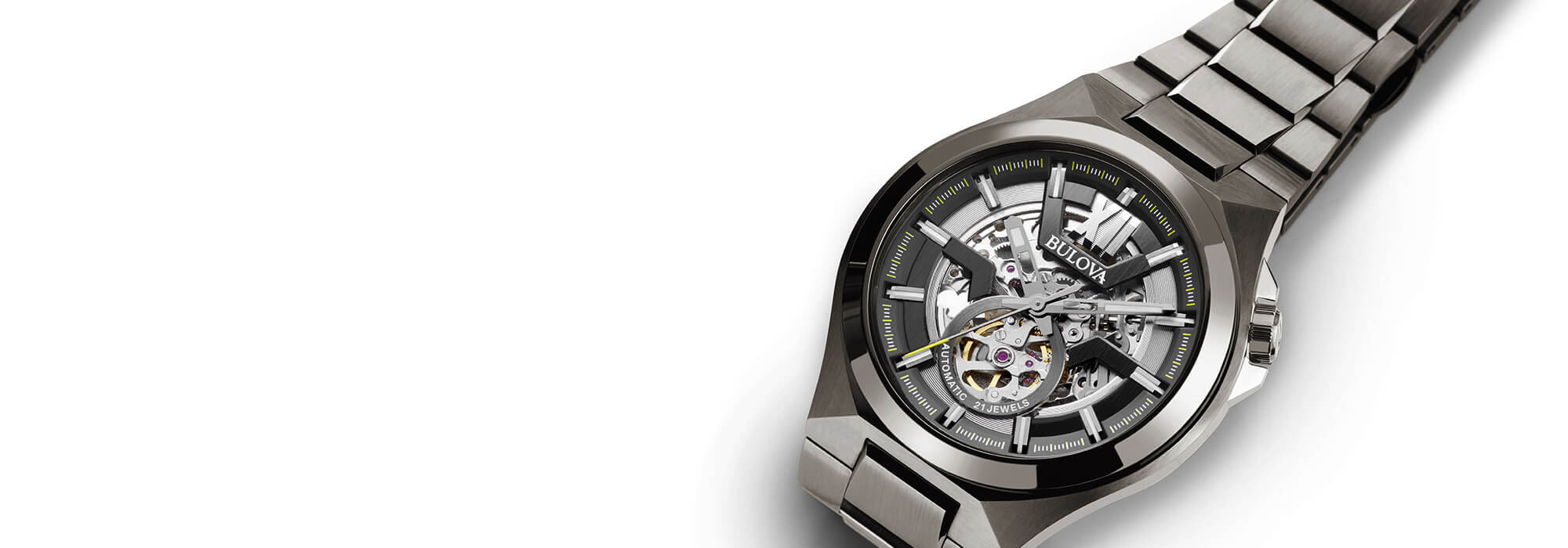 É a união perfeita entre estética e mecânica: o design audacioso da caixa se casa com o classicismo do movimento mecânico que fica exposto no mostrador. A coroa colocada às 2 em ponto é o distintivo da Maquina.