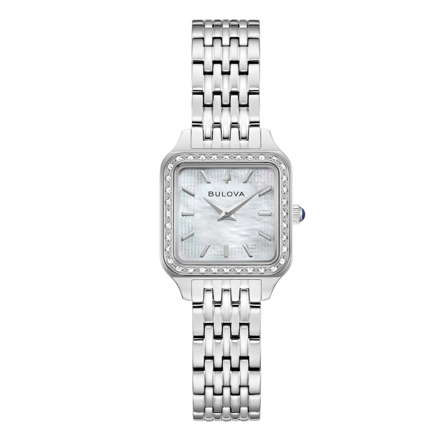 Movimento de quartzo GL24-10A, 2 ponteiros. Mostrador em MOP, com 36 diamantes de 1 mm. em bisel.